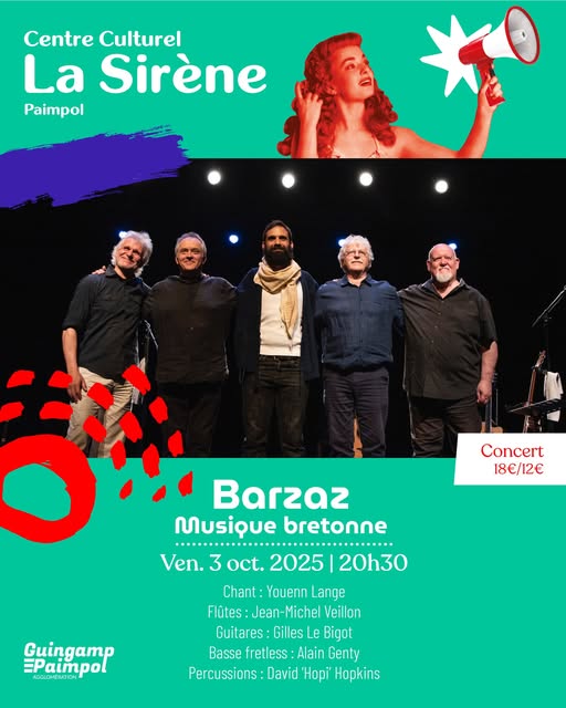 La saison 2025-2026 démarre de plus belle le 3 octobre avec BARZAZ ����#barzaz s’est révélé au public breton en 1989, avec la sortie d’un disque des plus marquant des années 80/90 en Bretagne ! Reformé en 2013, le groupe revient sur scène pour une seconde période créative, hélas interrompue par le décès de Yann-Fañch Kemener en 2019. Mais les musiciens de BARZAZ (Gilles Le Bigot, Jean-Michel Veillon, Alain Genty et David ‘Hopi’ Hopkins) décident en 2022 d’inviter en concert l’excellent chanteur Youenn Lange afin de rendre leur hommage à Yann-Fañch, en ré-interprétant une sélection de son immense répertoire (Gwerzioù, sonioù ha tonioù-dañs). Après avoir découvert le premier album de cette nouvelle ère en 2024, il est temps de profiter de leur passage exceptionnel à La Sirène !