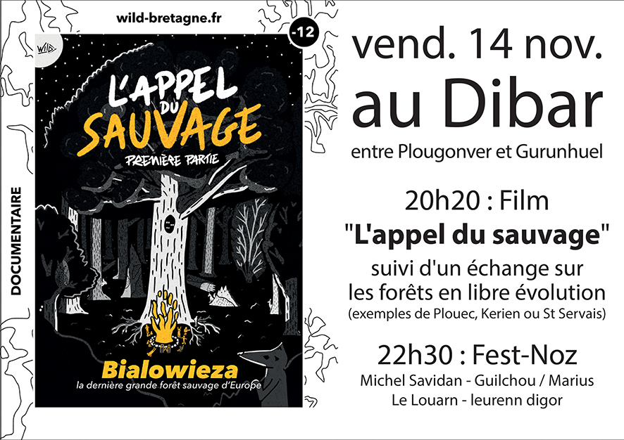 Soirée au Dibar le vendredi 14 novembre prochain. Projection du film de l’association Wild BZH sur les forêts en libre évolution, suivi d’un fest noz avec Michel Savidan, Marius-Guilchou, Le Louarn, leurenn digor.