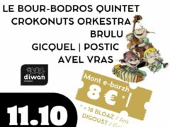 Fest-noz à Pédernec le Samedi 11 Octobre, organisé par le Comité de Soutien de l’école Diwan Lannion. Sur scène, les groupes : Le Bour-Bodros Quintet ; Crokonuts Orkestra ; Brulu ; Gicquel… da heul »
